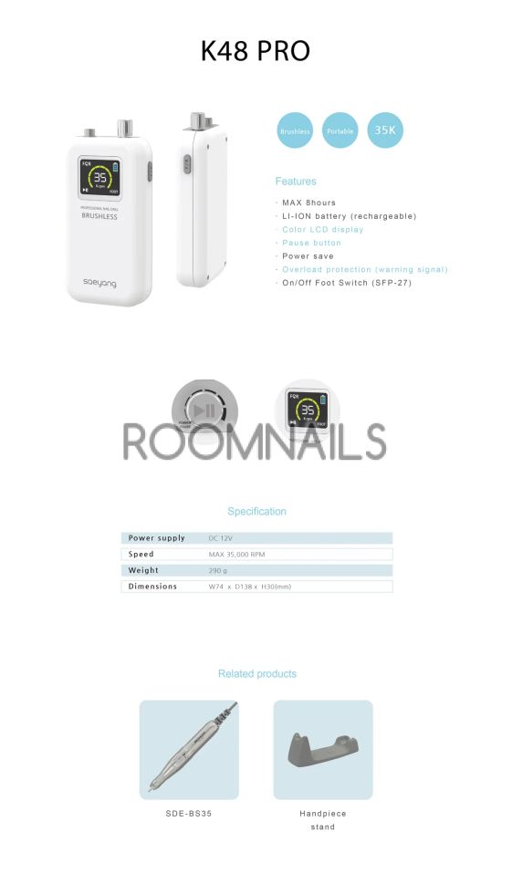 Компактната безжична pila Saeyang Marathon K48 PRO с безчетков мотор е надеждно устройство, идеално за мобилни стилисти за нокти. Тя позволява прецизна работа върху ноктите и кожичките, осигурявайки идеална основа за по-нататъшни стъпки на стилизиране. С възможността да работи до 8 часа с едно зареждане , тя осигурява комфорт и ефективност по време на дълги процедури.